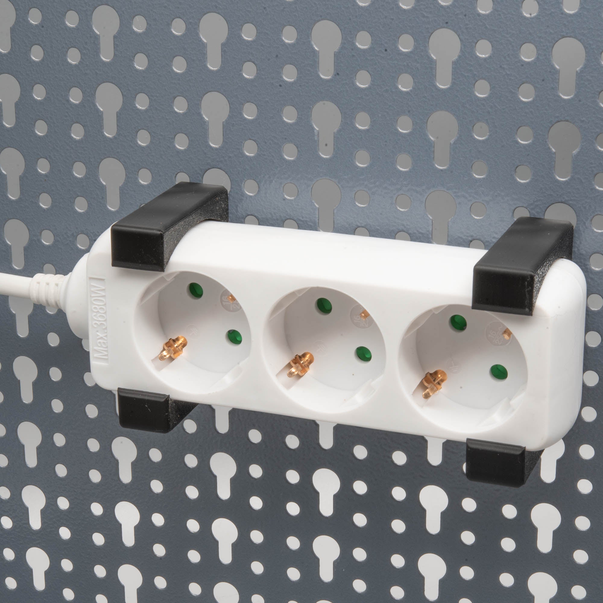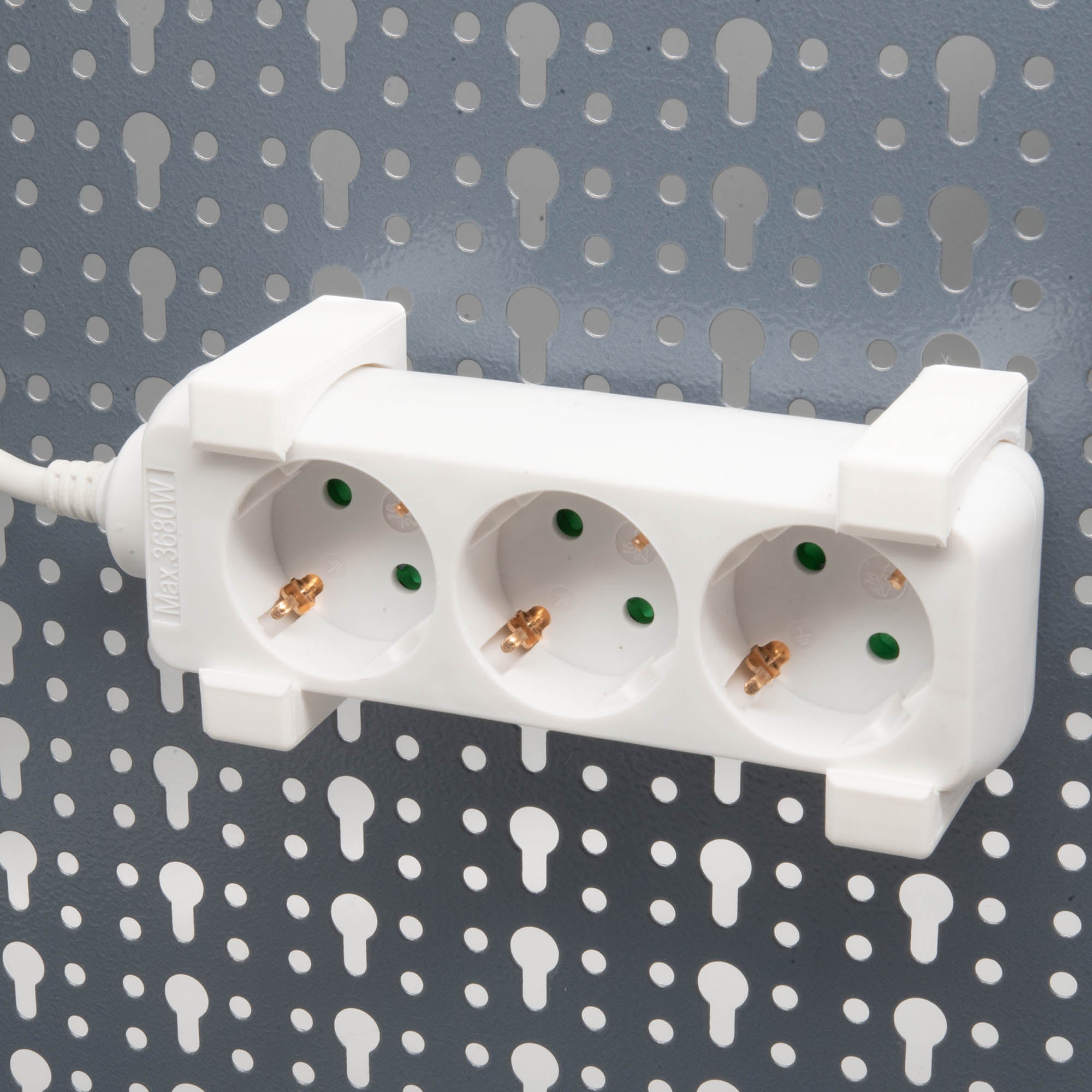 - Praktische Universal-Halterung für Steckdosenleisten passend für eine Küpper Lochwand.