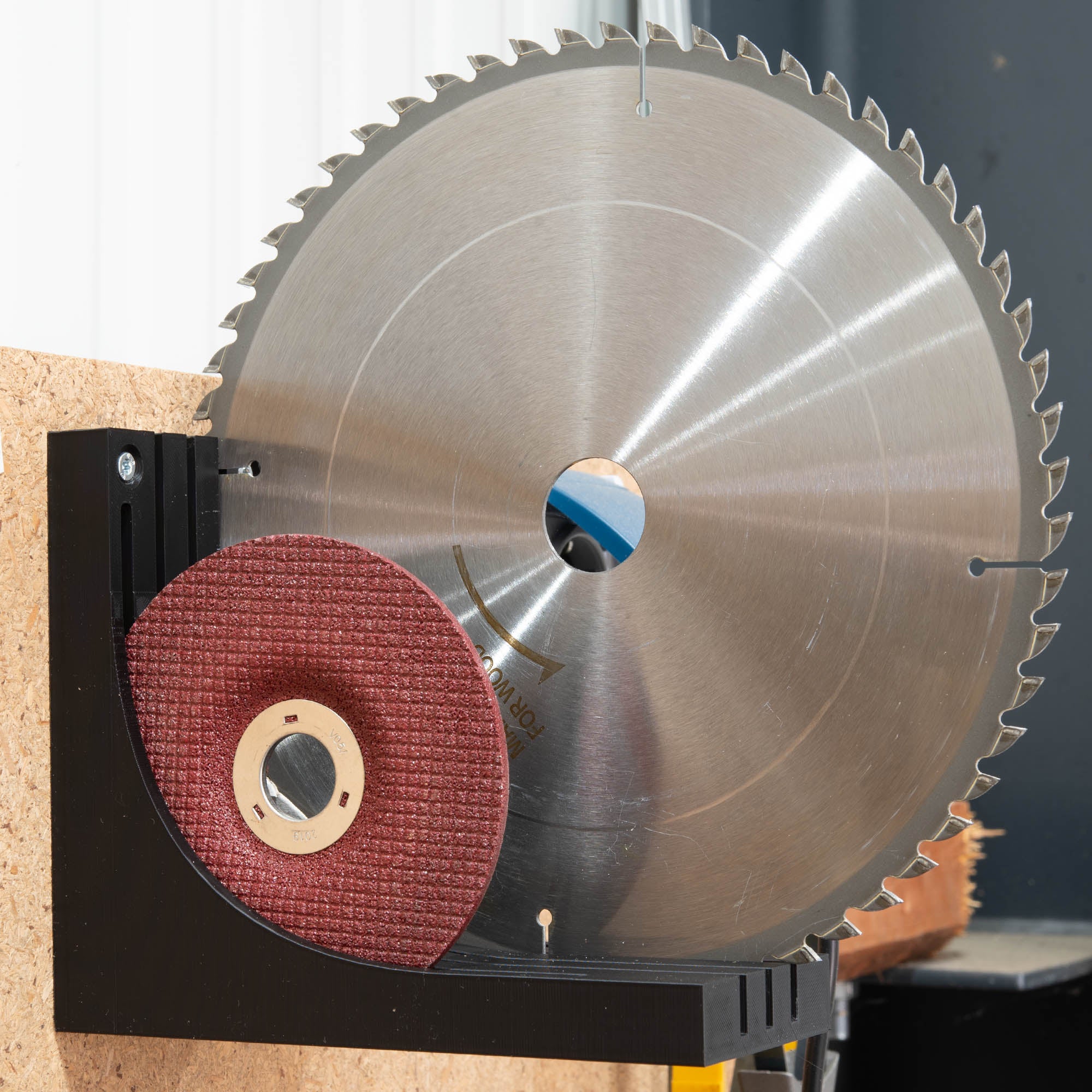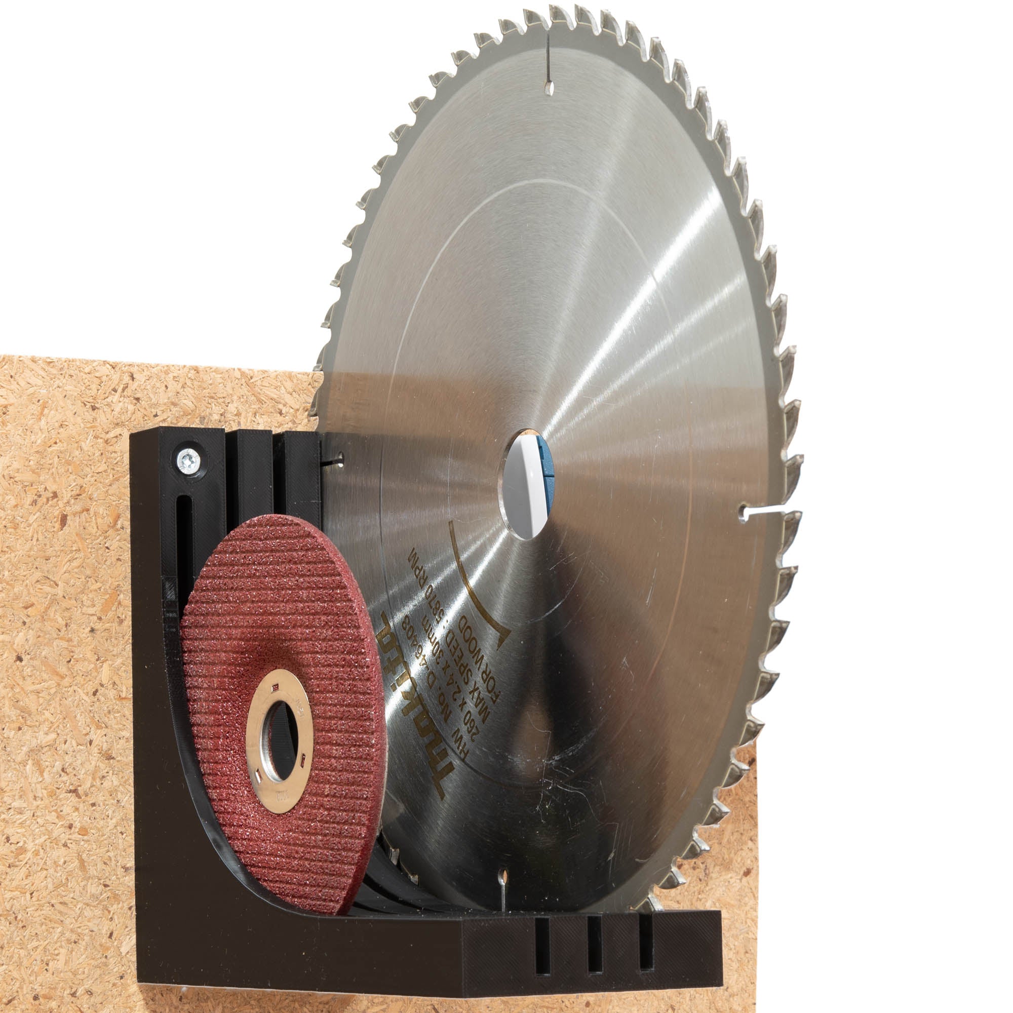 • Praktische universelle Wandhalterung und Tischständer für Kreissägeblätter.